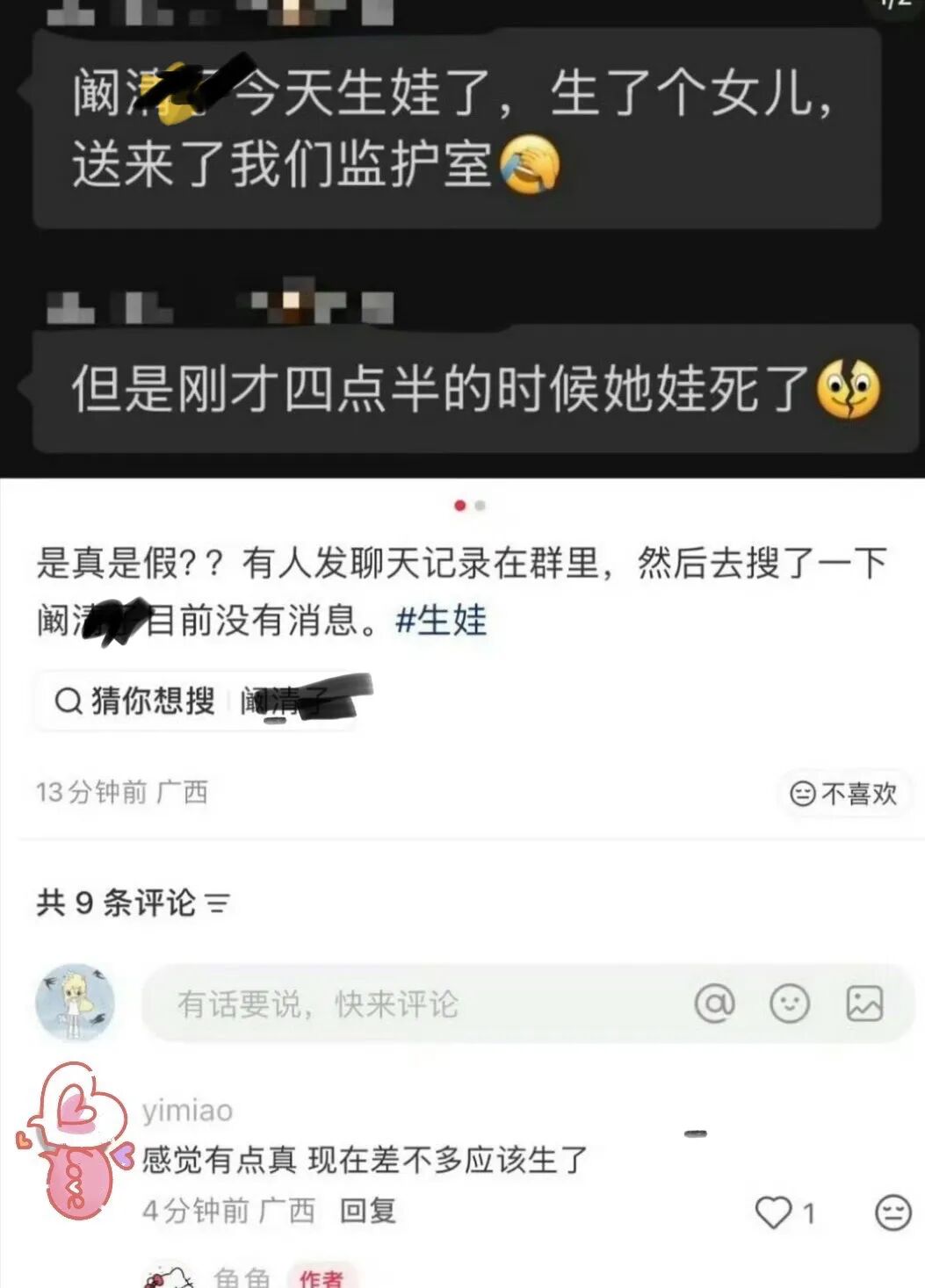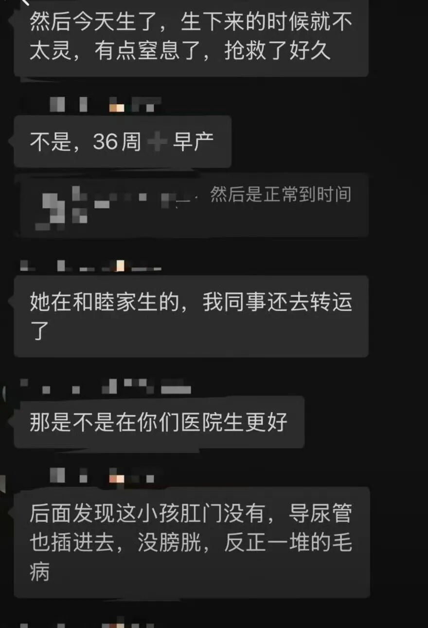此前,网传聊天截图曝光某女明星在该院生产的孩子健康状况、内容详细披露某女明星(网传为阚清子)在和睦家医院生产,涉及婴儿早产、严重先天畸形(无膀胱、无肛门)、转院抢救及夭折等细节